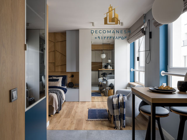 استفاده از کمد دیواری برای تقسیم بندی فضای اتاق خواب و سالن پذیرایی